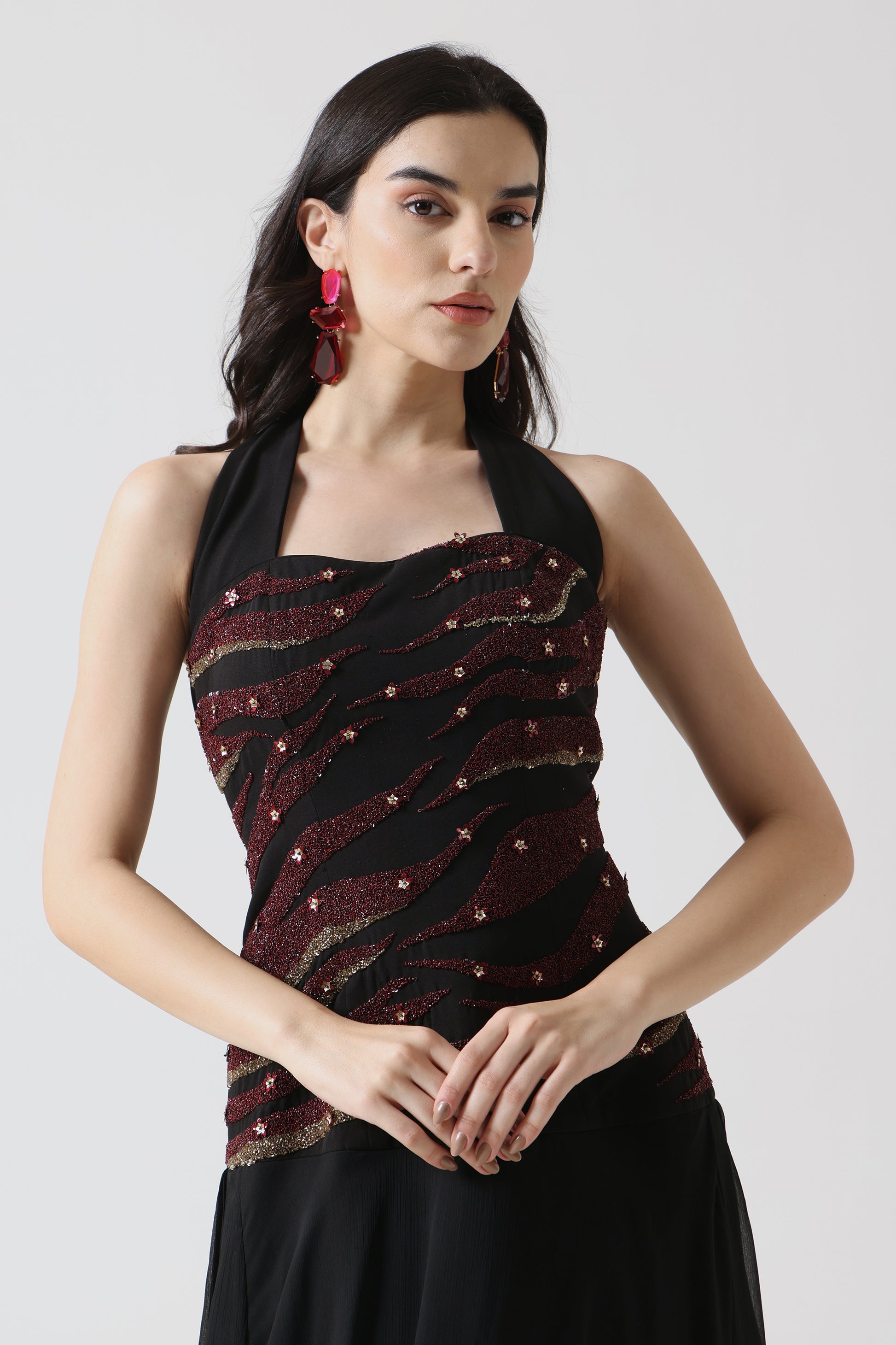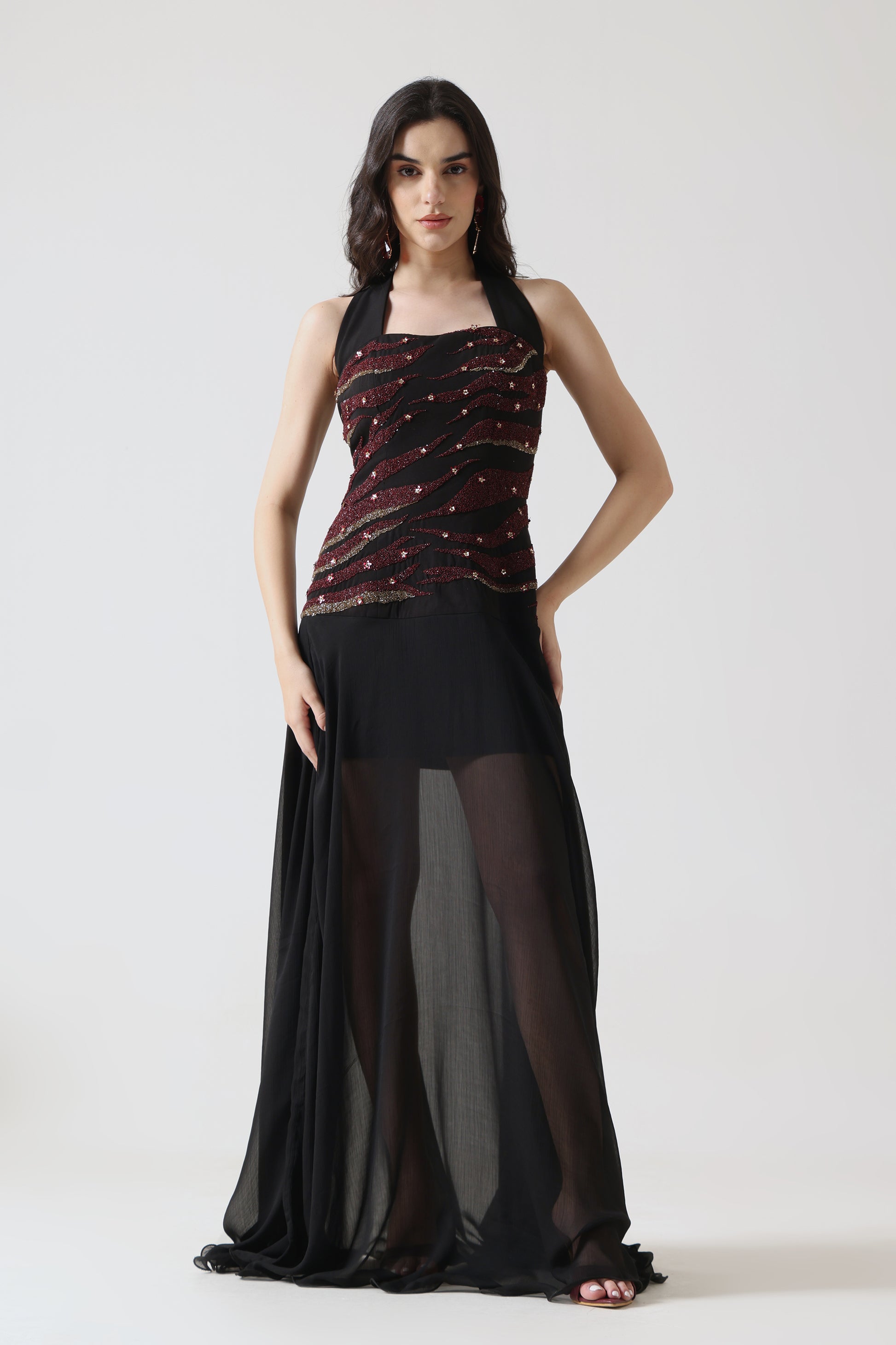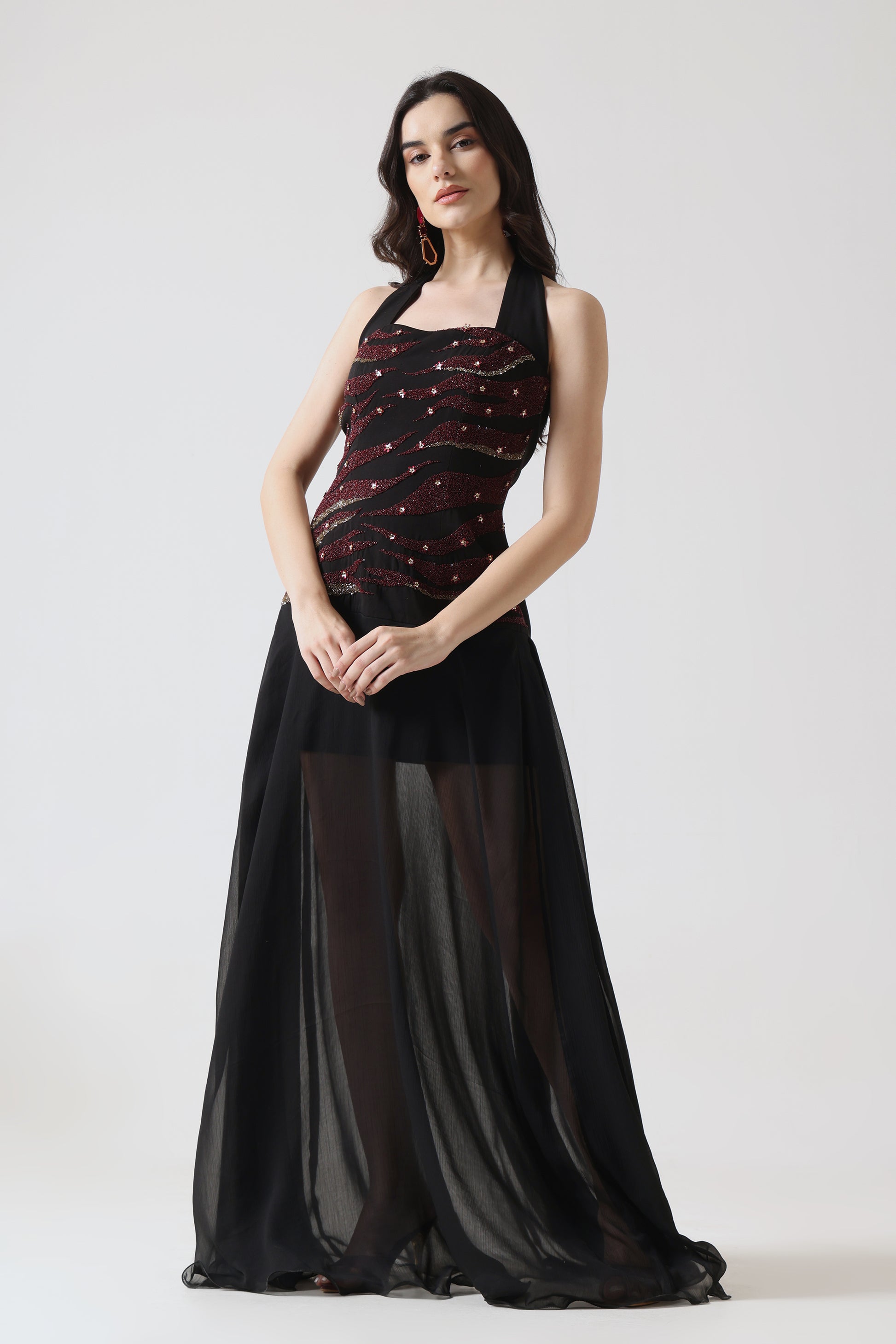 Halter-Neck gown featuring Handmade Sequin Embroidery in wine and gold tones