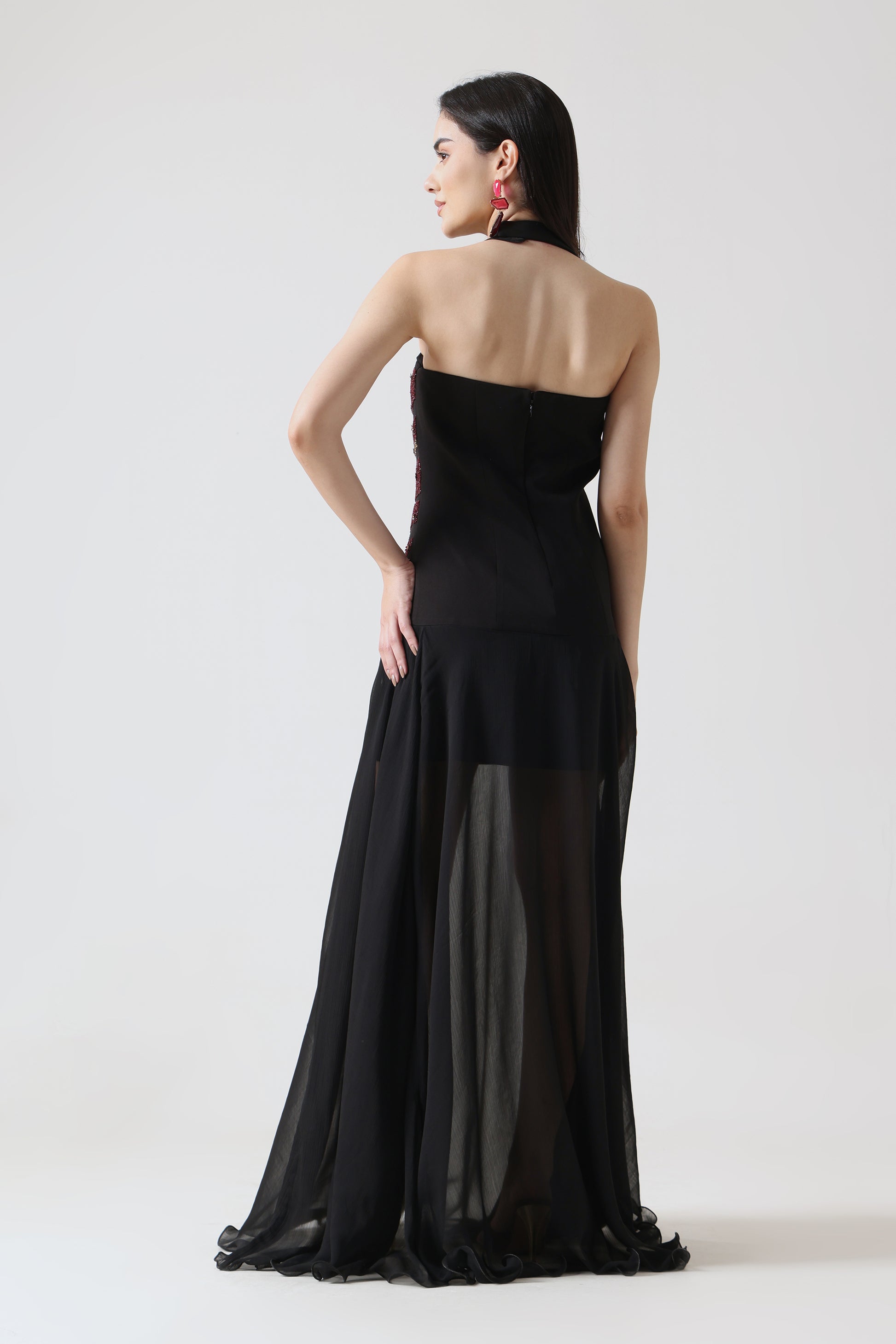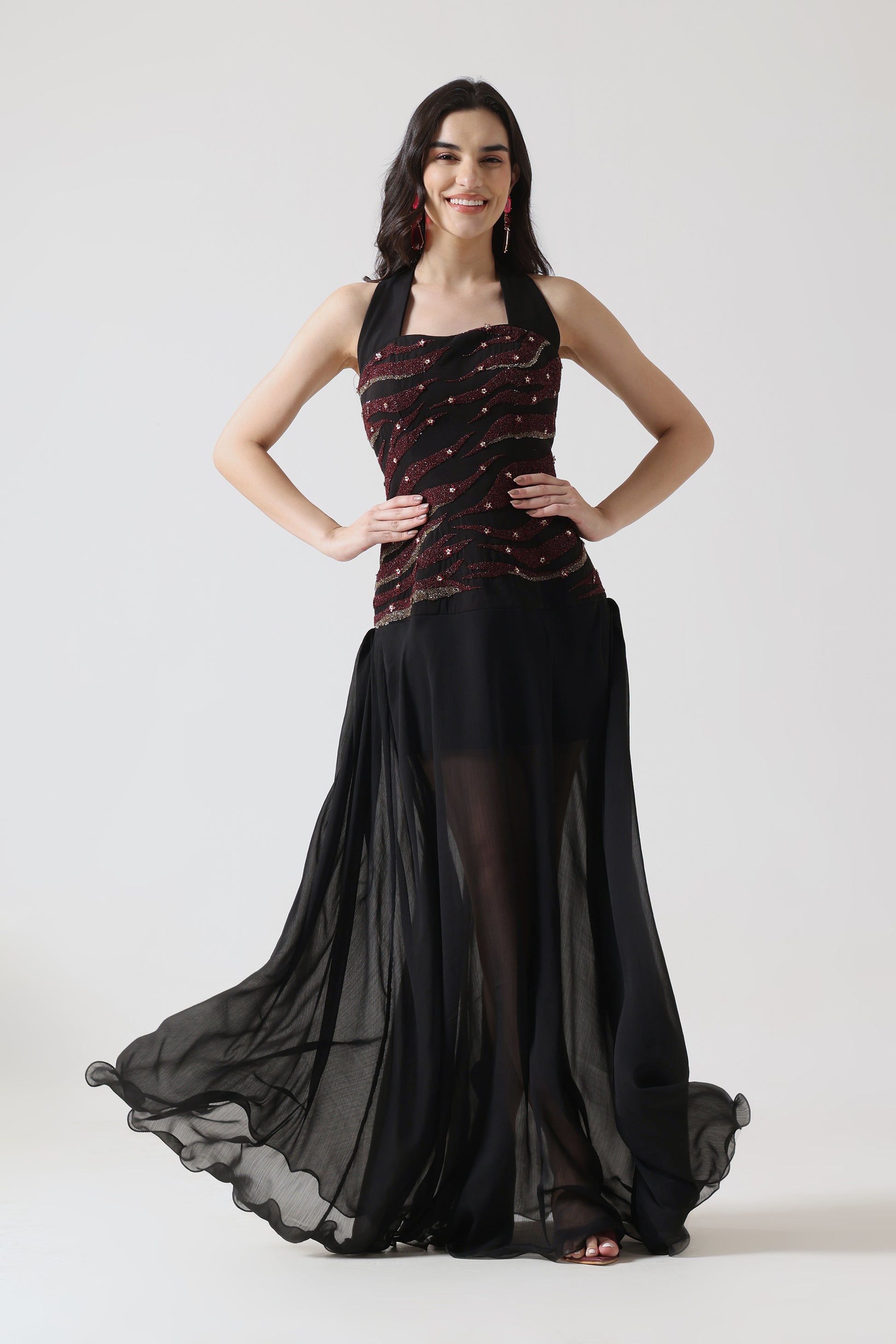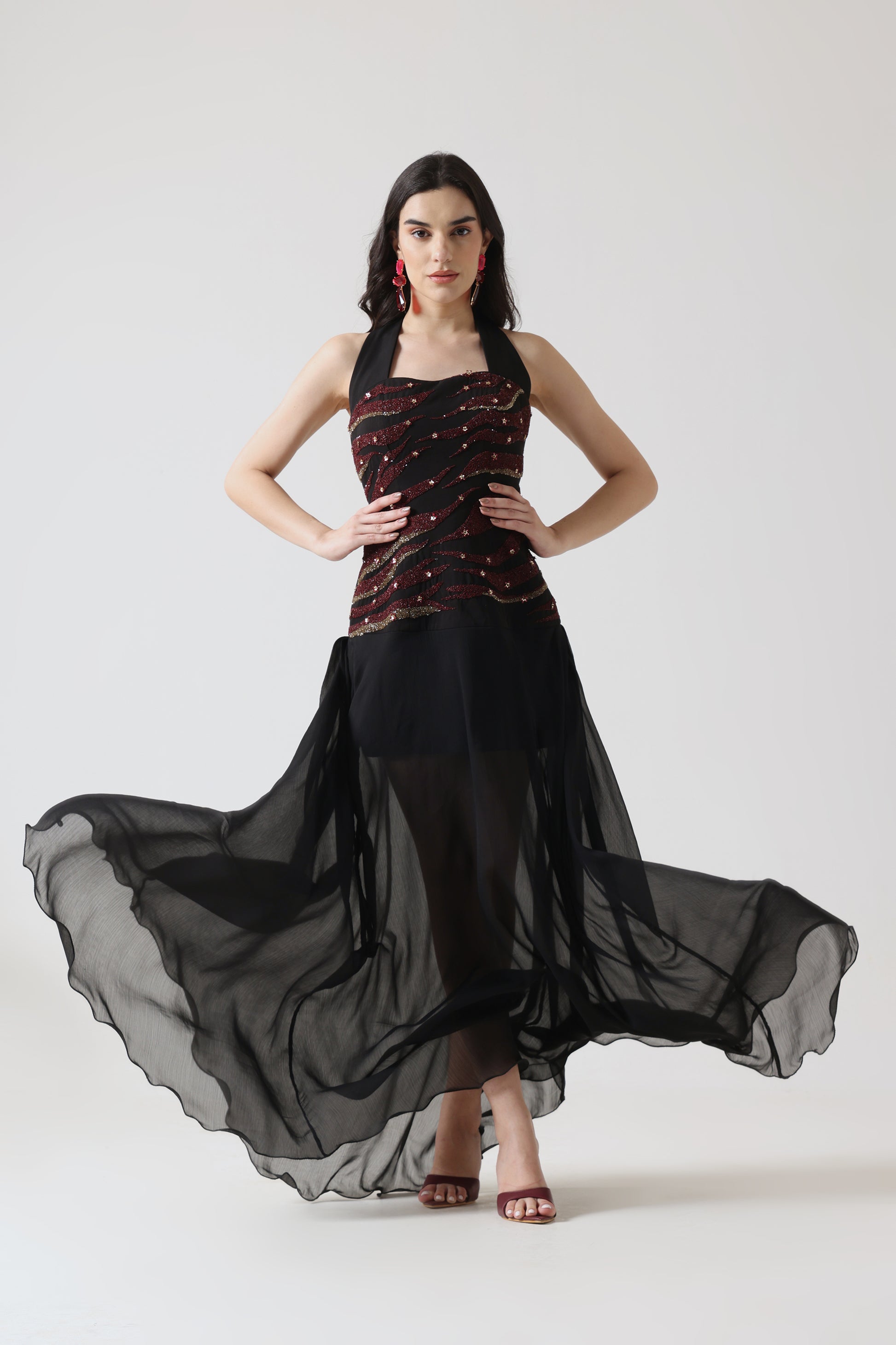 Halter-Neck gown featuring Handmade Sequin Embroidery in wine and gold tones